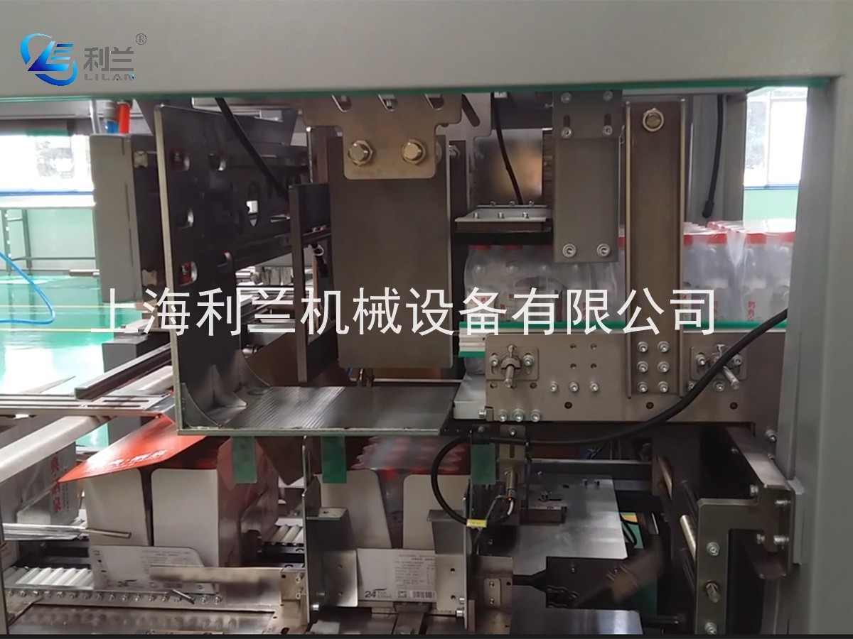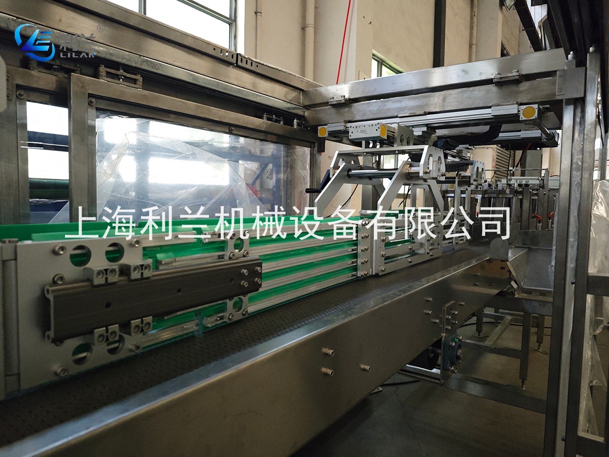 ● 上海利兰针对多瓶排列装箱(如48瓶/箱),定制设计落差式裹包机。