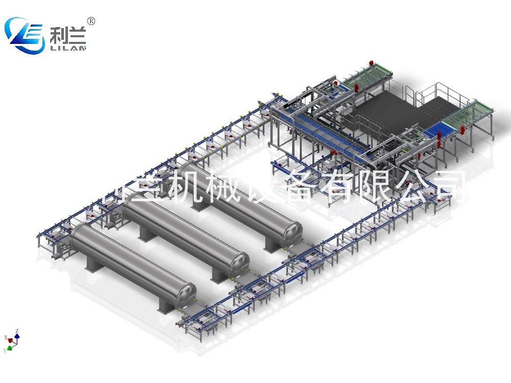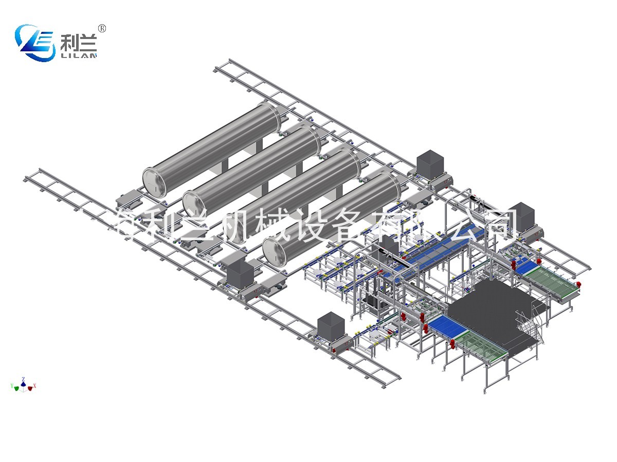 生产时,待杀菌产品通过输送带输送到装笼机,产品会安照编好的程序自动整列,当产品完成整层的排列后,夹具会将整层产品移至笼框位,吸放隔板。逐层进行,装满整笼再由链条输送/台车搬运进釜杀菌,杀完菌后,杀菌釜会把笼框输送到链条线/台车上,自动运输至卸笼机,卸笼机会将产品逐层卸至产品输送上,实现全自动无人化生产。